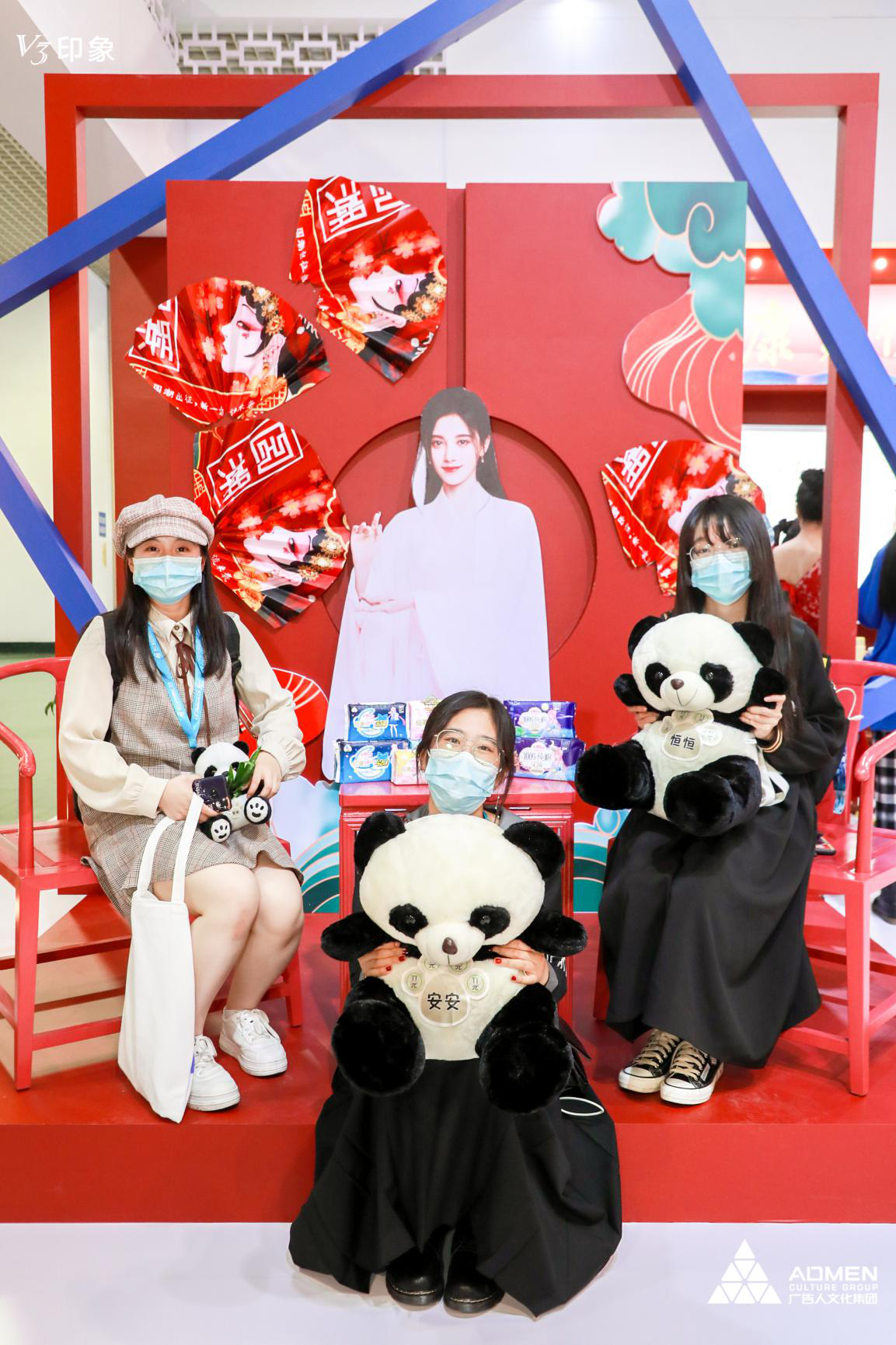 彩虹多多集团展位的正红布景极具特色,吸引了众多国风爱好者前来打卡,不少汉服小仙女都被熊猫玩偶萌翻了,纷纷合影留念。